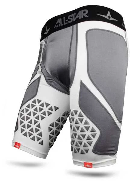The System Sevenβ’ HIT KNITβ’ Technology catching shorts provide foul ball protection from the top of the quad through the inner thigh.Β The padding is a mere 3mm thick and is molded directly to this high performance compression short for extreme durability and protection.Β Double-wall side panels are included for sliding protection on the basepaths and a cup pouch is also included.Β These catcher’s shorts are essential equipment for all All-Star Focus Team members and players at all levels.